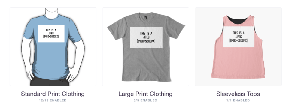 - Make sure your standard file size is big enough! You can size down a large design via the upload formatting page, but you can’t size up a small design. My uploads are always 16×22 inches (5600×8400 pixels), which is even larger than I need most of the time!