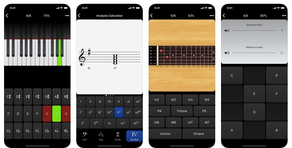 If you’re brand new to music theory, simply learning to identify notes on the staff is a good starting point. Music Tutor is a great app for that! It plays like a simple game, where you practice identifying notes on the staff by their note name or by their corresponding piano key. You can practice in treble, bass, and alto clefs. (If you sing soprano or alto, you’ll likely only ever use treble clef. Tenors and basses may use bass clef. Alto clef is very uncommon in vocal scores.) The app also includes a handy reference to help you learn.