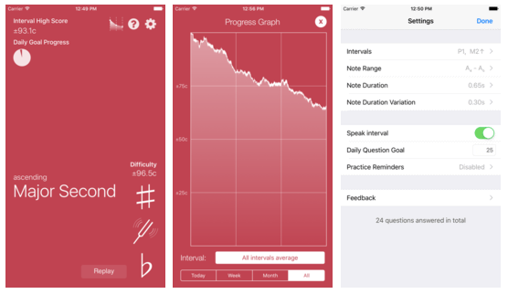 This app adds a little more depth to your intonation understanding as established by the previous app. In Tunerval, you have to identify whether the second note is sharp, flat, or in-tune, which requires careful listening and plenty of practice. Each time you choose correctly, the exercise becomes slightly harder by a few cents. (Cents is the unit of measurement used in evaluating intonation. If you’re a few cents off a note, no one will tell, whereas 50 cents off is technically another note entirely!) Further, Tunerval is so named because it teaches you to tune intervals– the spaces between notes.