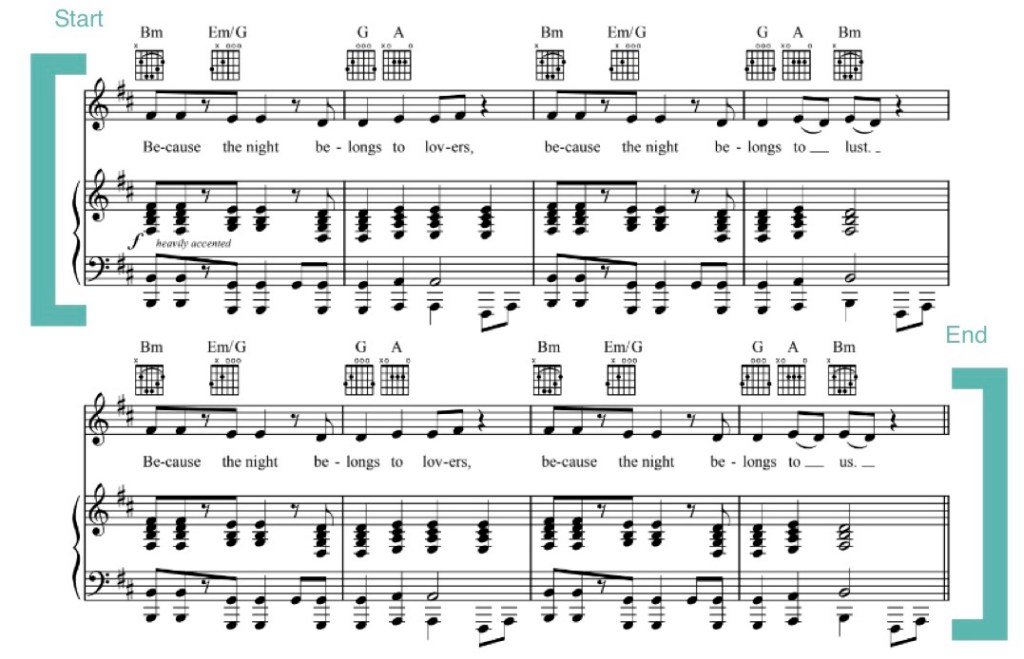 - Mark where in the music your cut will start and end. Here’s an example of how that might look: